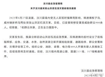 #四川汶川山洪泥石流#【#四川汶川山洪泥石流7人失联#】6月27日凌晨,四川汶川县境内受无人区短时强降雨影响,绵虒镇板子沟、威州镇新桥沟两处突发山洪泥石流灾害。目前,已妥善转移安置受威胁群众900余人。经排查,7名群众失联,正在全力搜救中。(汶川县应急管理局)